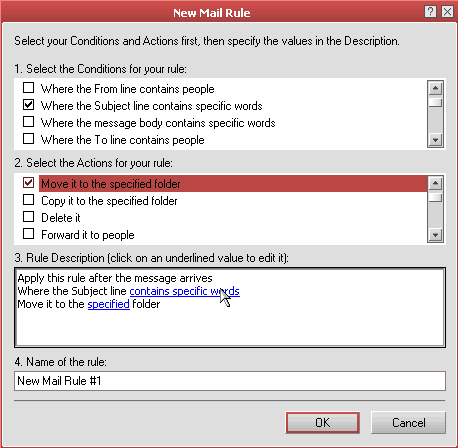 - Now 1. Select the Conditions for your rule and check the box next to Where the Subject line contains specific words, then 2. Select the Actions for your rule and check the box next to it Move it to the specified folder, then 3. Rule Description and click the contains specific words link.