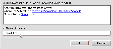 - In 4. Name of the rule enter n appropriate name, such as Spam Filter, then click OK.
